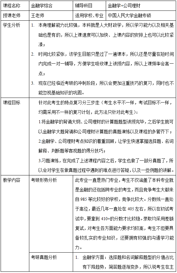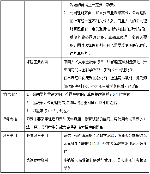 中国人民大学考研辅导班:中国人民大学金融专硕专业课授课计划