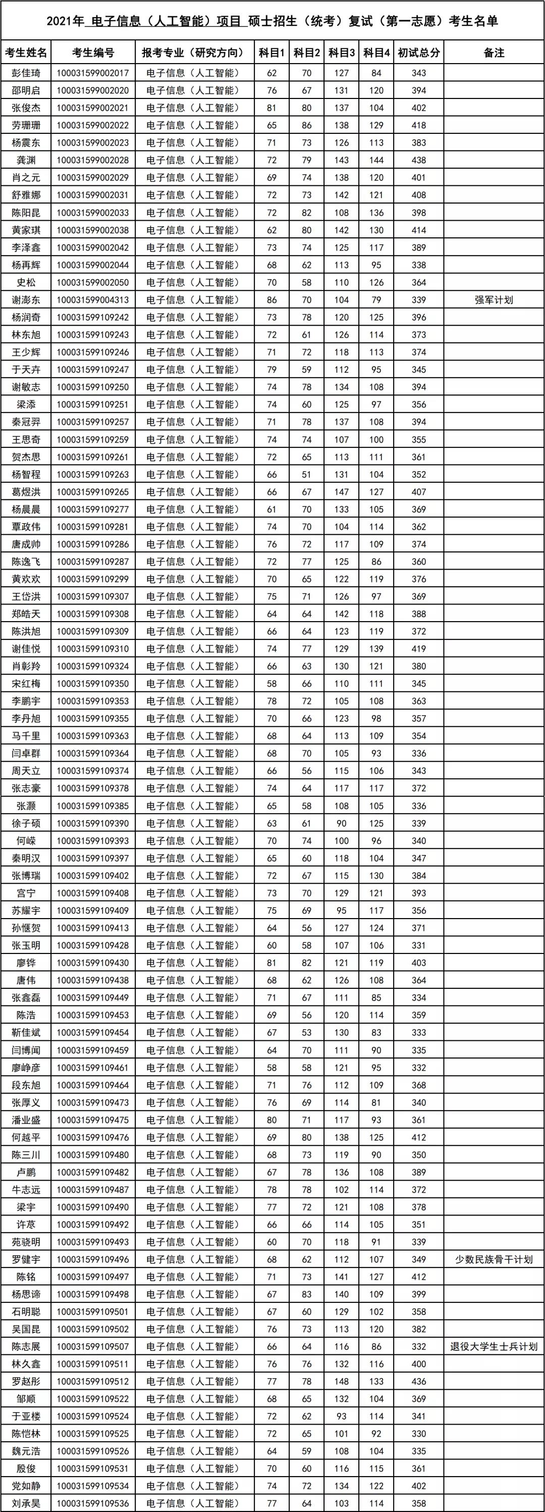 清华大学深研院2021年电子信息(人工智能)硕士生复试名单