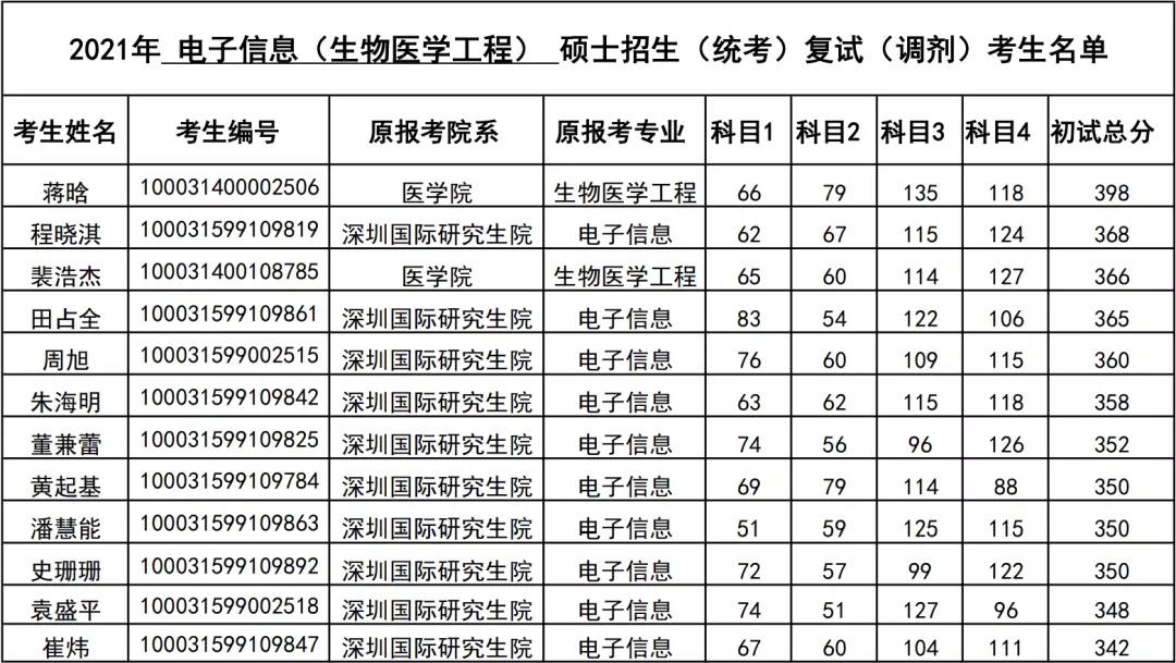 清华大学深研院2021年电子信息(生物医学工程)硕士生复试名单