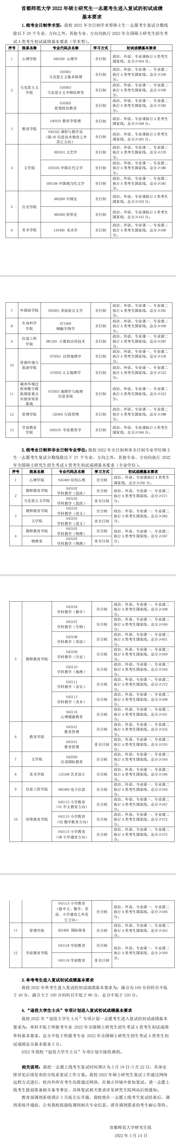首师大考研辅导班:2022年首都师范大学硕士研究生一志愿考生进入复试的初试成绩基本要求