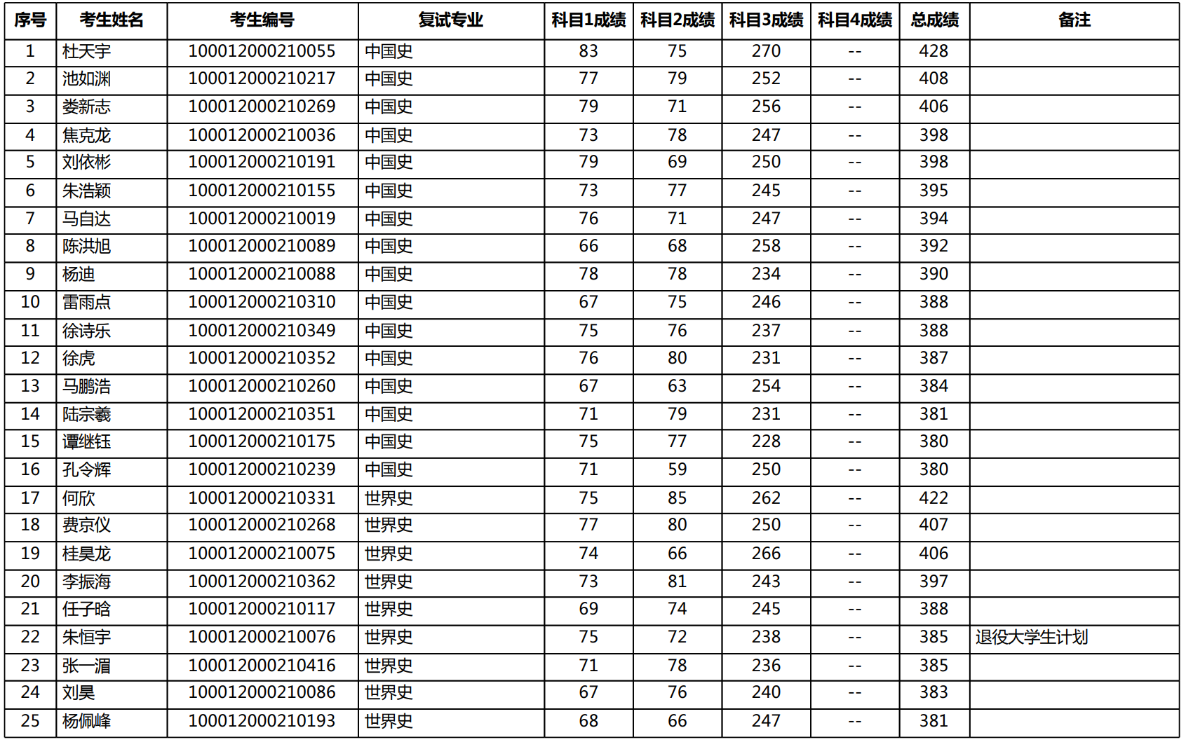 北京大学历史学系2022年硕士研究生复试名单已经确定。共分中国史和世界史两个专业。世界史复试人数为9人(含退役大学生士兵1人),中国史复试人数为16人,共计25人,名单如下: