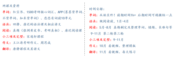(一)首先是英语,英语是个循序渐进、逐渐积累的过程,这是我当时跟的老师和资料以及对应的时间安排。