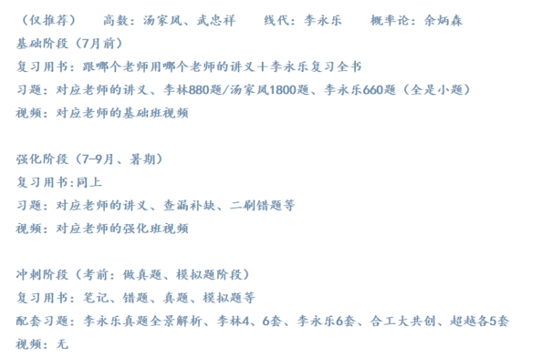 (二)其次是数学,西交管院对管科的要求是考数学一,难度较大。因此大家认真学习数学且一定要严格按照规划去完成。这里是我数学跟的几位老师和时间安排,大家也可以去网上多看一看其他的老师,然后听听他们的课,选出一个最适合自己的老师。复习的时间安排就是分为基础、强化,还有最后就是考前做真题,做模拟题的冲刺阶段。大致的就是你选定哪个老师然后就去看他的课,然后做相应的习题,我推荐的总共就是李林880、汤家凤1800、李永乐的660,因为我去年高数的基础课跟的是汤家凤,但是后期强化的时候,我觉得他的课看了之后还是不会做题,就又去听了武忠祥的课。所以说我前期基础做的是1800的基础题,后面强化就又换成了李林的880,汤家凤的1800也是不推荐大家强化的时候做,因为太多了做不完。然后李永乐的660全是小题就可以从头刷到尾,并且自从21年数学小题变多以后,大家更要额外重视选择题和填空题。线代从头到尾跟李永乐爷爷,概率论余炳森老师讲课非常生动形象,大家也可以看看。