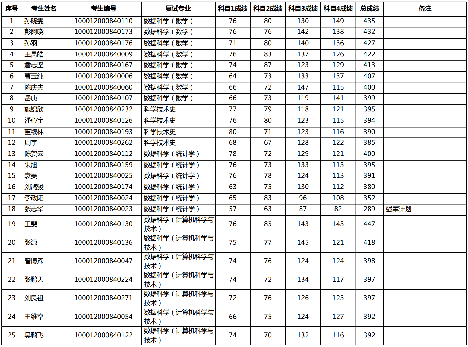 复试成绩采用百分制(或换算成百分制)记分,60分为合格。复试成绩不及格者不予录取。复试成绩及格者,依考生的总成绩排名以招生名额为限依次录取。总成绩包括两部分,即初试成绩和复试成绩。其中数据科学类专业:初试成绩占总成绩60%,复试成绩占40%;科学技术史专业:初试成绩占总成绩的50%,复试成绩占总成绩的50%。