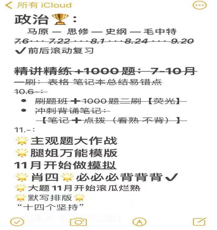 如图是我之前考研时的政治复习规划。前面也有提到,我文科方面比较薄弱,所以我在政治上下的功夫不多,每天都是只花一个小时的时间,只是在最后半个月天天晚上背肖四肖八的大题。10月前就是倍速看完旺仔老师的强化课并一刷完《1000题》,一般是看一章刷一章;11月前二刷之前的错题同时看《冲刺背诵笔记》来记忆易错的知识点(看即可不需要背),11月初开始就要刷模拟卷的客观题了,限时刷,别太在意分数也别去跟别人比较找闹心,错了记下就行呗。模拟卷我是但凡我听说过的老师出的卷子我都买了,但感觉老师们出卷子的水平.参差不齐,题目错的、答案错的都有。出卷子还得看你肖爷爷!之后就是准备主观题了,我是跟了空卡的主观题视频,如果你和我一样自己背不知道哪里下手还觉得无聊枯燥的话,可以看看空卡的视频,背书思路很有趣,她会把知识点段子化公式化,会帮助你把肖四肖八的大题串联背诵,即使题目千变万化你也会有话可写。