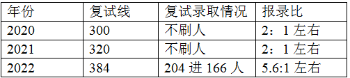 在2022年的复试当中,竞争相对激烈。复旦目标招收166人,有204人进入复试,复试比为1.2;在最后的综合成绩中,初试成绩与复试成绩占比为1:1。初试总分500分,复试总分100分,换句话说复试1分抵得上初试5分。关于22年的成绩分布,最低分为384分,最高分为448分,大部分人分数集中在384至410之间。