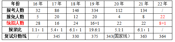 然后讲一下东华大学,首先它是一所211院校,地理位置在上海市中心,毕业可落户,上海实习机会多且交通方便。我本科是双非,所以最初想求稳,冲一所比较好考一点的211学校,东华国商考的是数三,而数学是我的优势学科,听说以往专业课给分高,能给到130以上,所以决定报考东华国商专业。以下是近几年的东华国商专业报录情况。22年具体情况是推免人数过多,推免+统招名额定的是30人,所以留给考研的名额只剩8个,最后扩招1个。(参考东华别的专硕专业扩招情况,扩的比较多,国商是因为今年报考人数也很少,所以扩的不明显,但还是一所比较好考的211学校)。国商复试线为364,最终录取名单中,最低分为368,最高分为413。