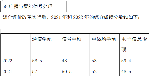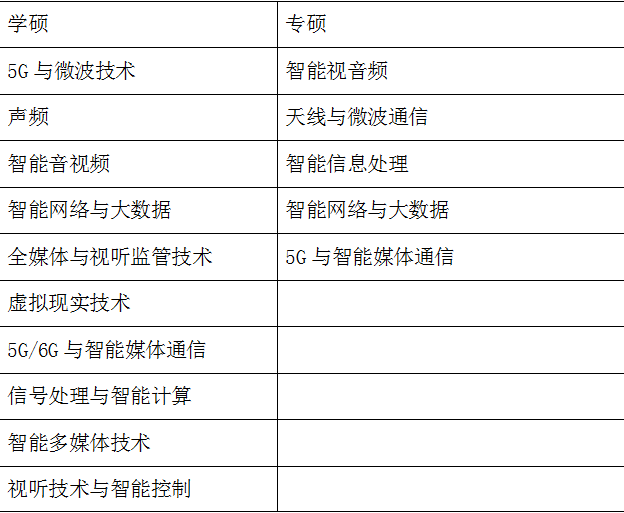 2021年起,中国传媒大学进行了研究生招生改革。对考生影响最大的变化是引入材料评议环节,会在公布国家线前要求考生提交本科成绩单、获奖经历、外语水平证明、科研设想等材料,由老师给出材料成绩,按初试成绩占比70%、材料成绩占比30%的方式得出综合成绩,即综合成绩=(初试成绩/5)*70%+材料成绩*30%根据综合成绩确定复试名单。这要求同学们注重本科阶段的积累,多多参加比赛和科研。本科经历不多的同学也不必太过担心,报考中传电子信息专业的多为双非一本和二本学生,总体而言并不会有太多人拥有丰富的竞赛和科研经历,且绝大多数院校复试时也会要求提交以上资料。采用综合成绩划线后,中传对总分和单科线的划定都是和国家线相同(2022年为总分273分,英语政治38分,数学专业课57分),对偏科同学更加友好。中传不公布报录比情况,2022年录取学硕114人(其中推免29人),录取专硕60人(其中推免6人)。专业方向如下表所示。据2022届考生估计,报录比在1:2—1:4之间(官方不提供数据,不保证准确性)