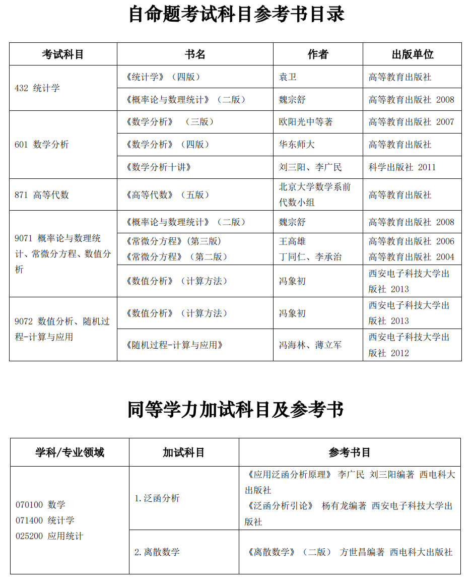 西安电子科技大学考研辅导班:2023年西安电子科技大学数学与统计学院考研各专业参考书汇总