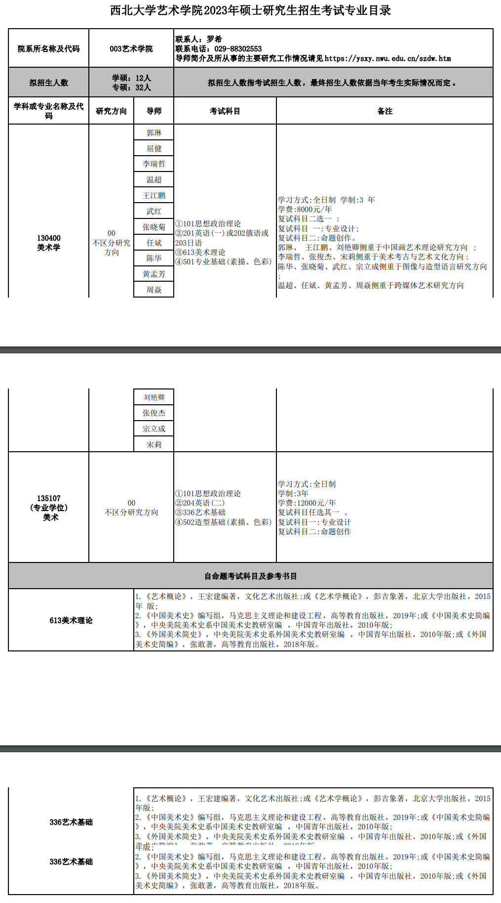 西北大学考研辅导班:2023年西北大学艺术学院硕士招生专业目录及参考书目