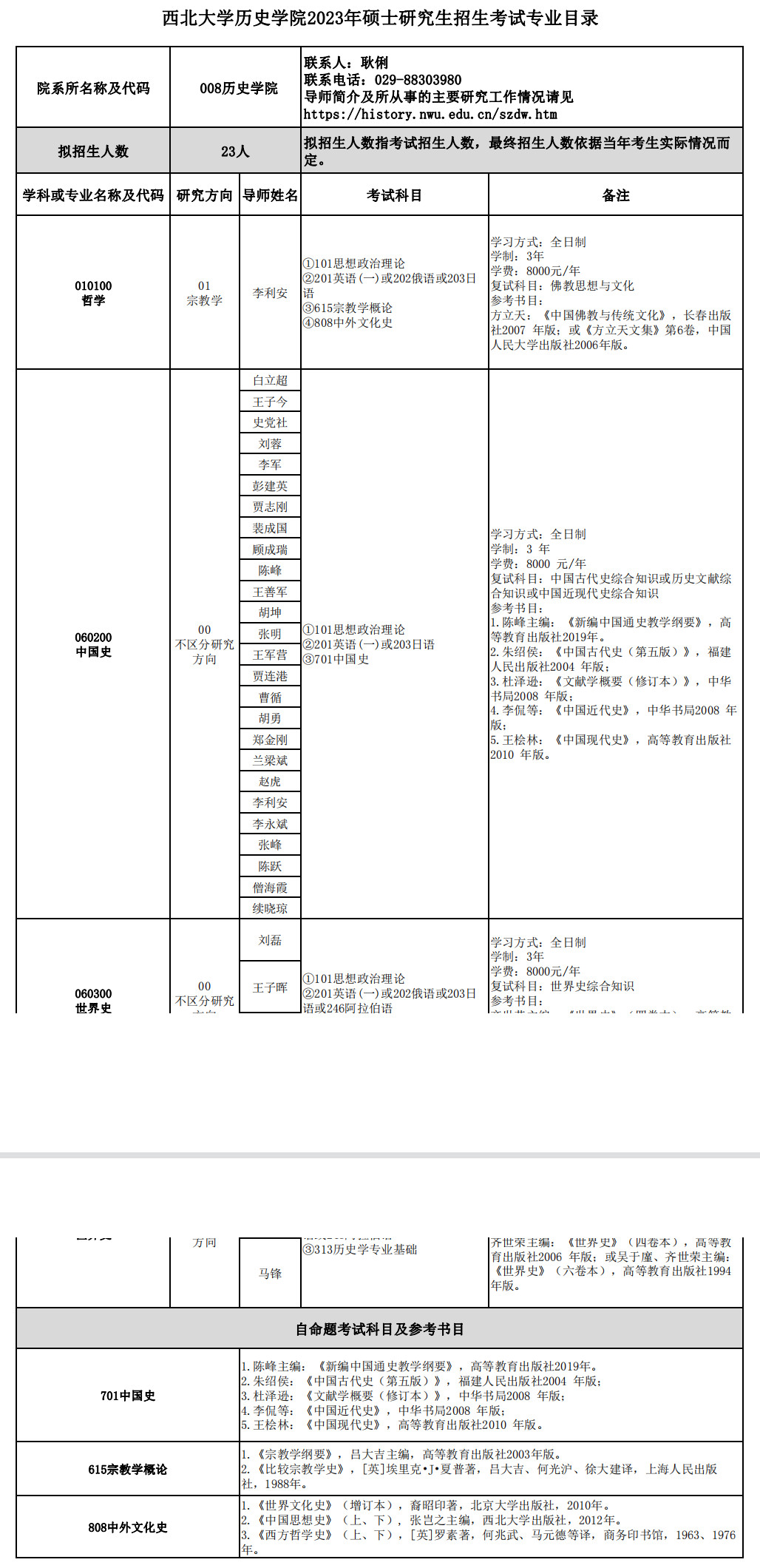 西北大学考研辅导班:2023年西北大学历史学院硕士招生专业目录及参考书目
