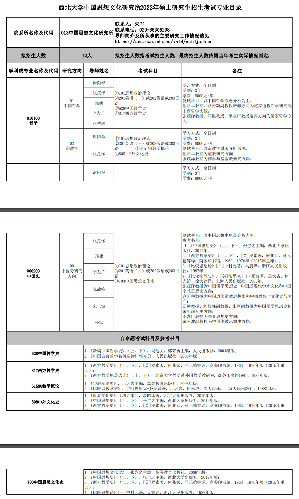 西北大学考研辅导班:2023年西北大学中国思想文化研究所硕士招生专业目录及参考书目