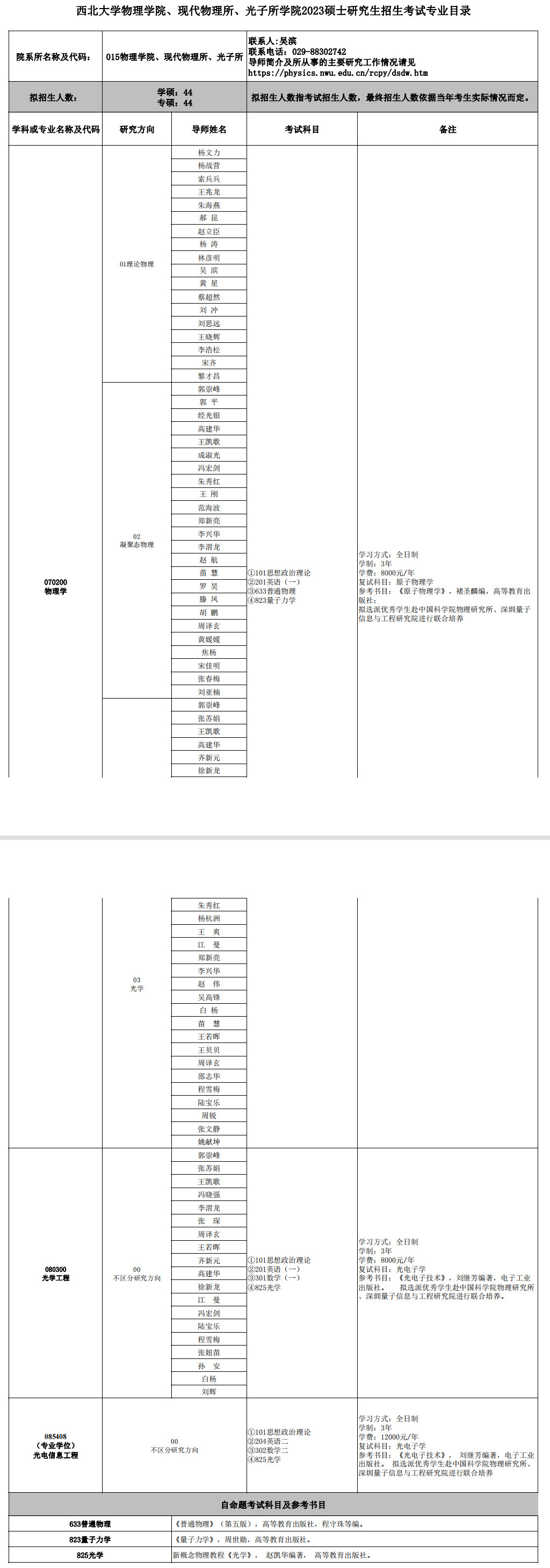 西北大学考研辅导班:2023年西北大学物理学院硕士招生专业目录及参考书目