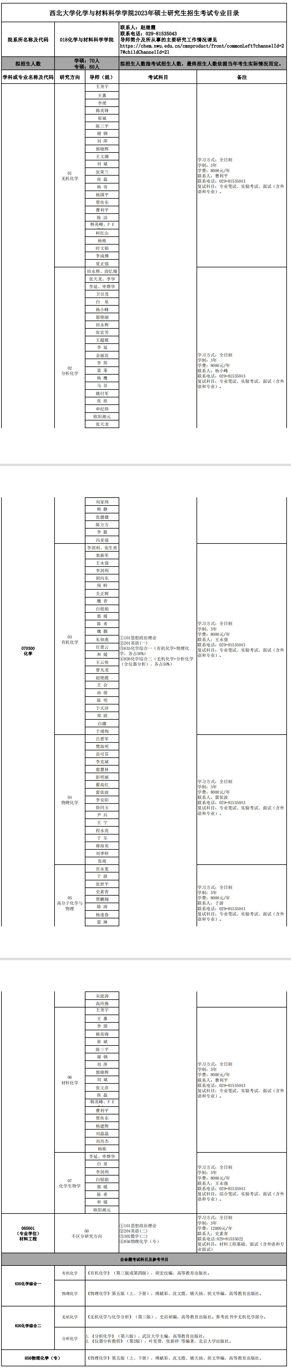 西北大学考研辅导班:2023年西北大学化学与材料科学学院硕士招生专业目录及参考书目