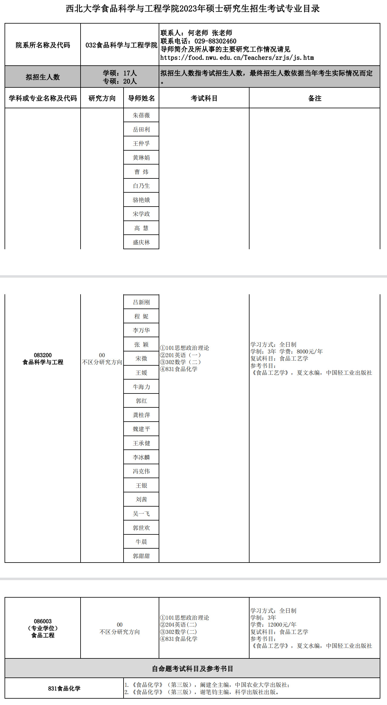 西北大学考研辅导班:2023年西北大学食品科学与工程学院硕士招生专业目录及参考书目