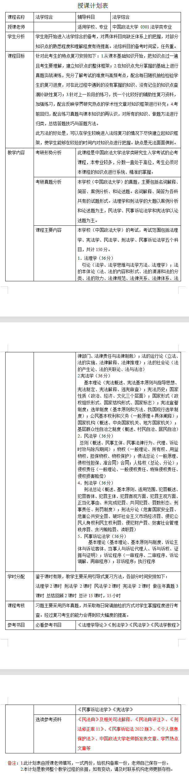 新祥旭考研一对一:2023年中国政法大学法学专业考研一对一辅导授课计划