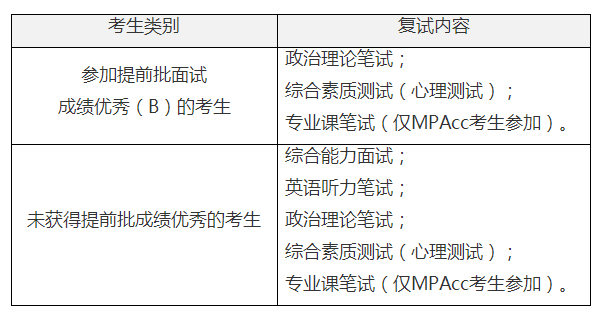 (1)参加提前批面试成绩优秀(B)的考生:政治理论成绩、政审合格后、专业课(仅MPAcc考生参加)合格,予以录取。