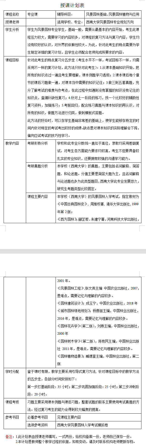 新祥旭考研:2024年西南大学风景园林专业考研一对一辅导授课计划