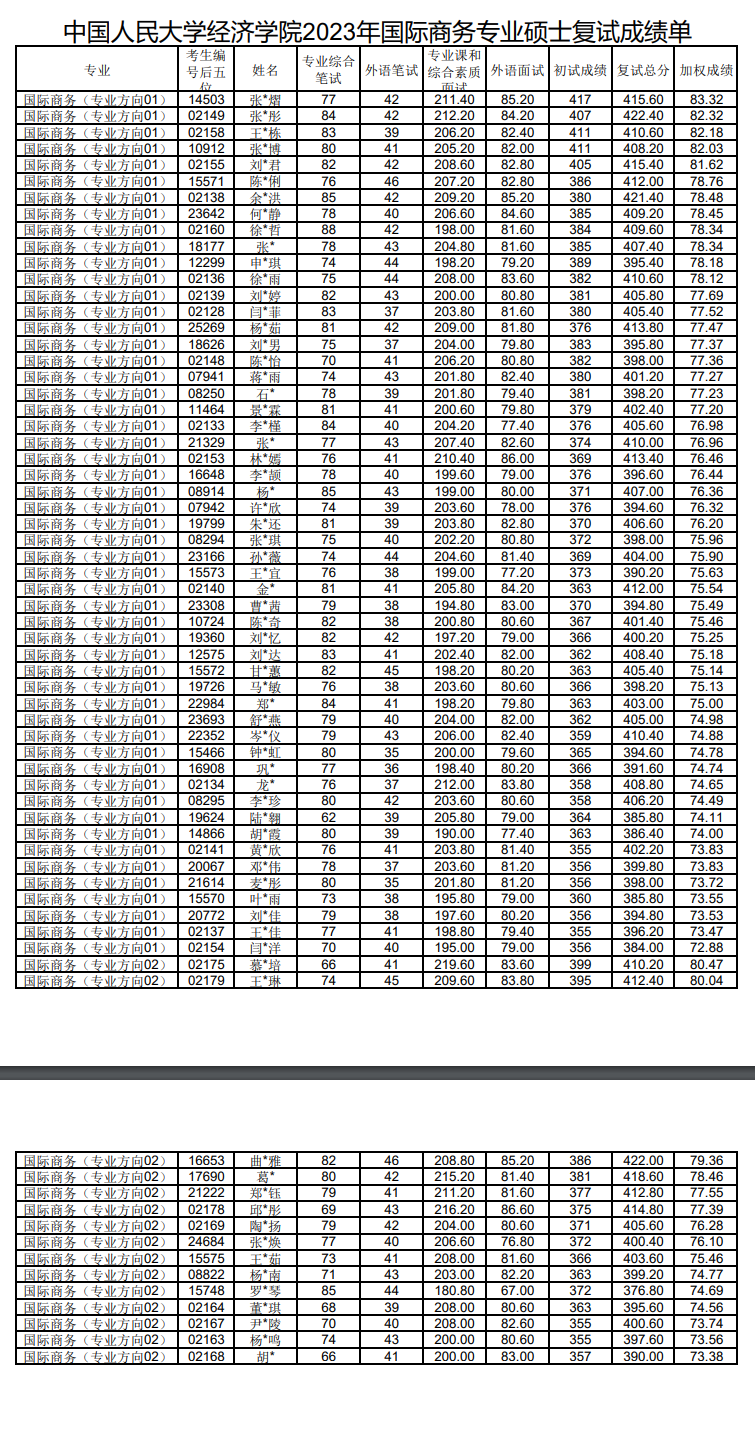 新祥旭考研:中国人民大学经济学院2023年国际商务专业硕士复试成绩单