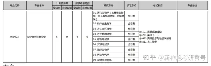 科目:① 101 思想政治理论② 201英语一③653高等数学与地质学基础④811古生物学