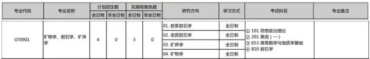 科目:① 101 思想政治理论② 201英语一③ 653高等数学与地质学基础④ 810岩石学.