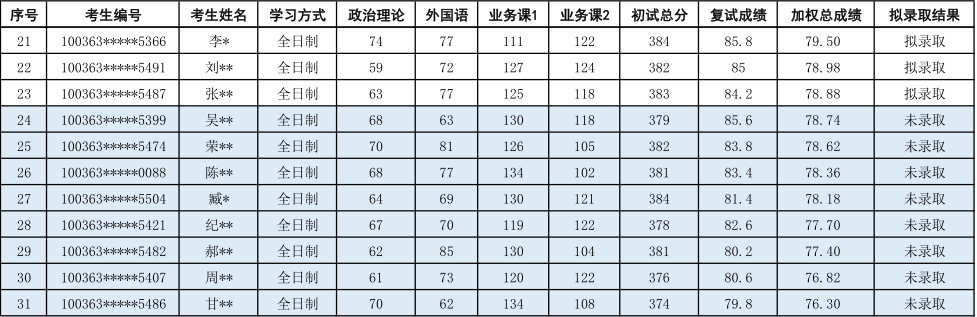 2.最终总成绩=初试成绩百分制*70%+复试成绩百分制*30%,如考生初试成绩为380分(满分500分),复试成绩为85分(百分制),则最后的加权总成绩为380/5*70%+85*30%=78.7。