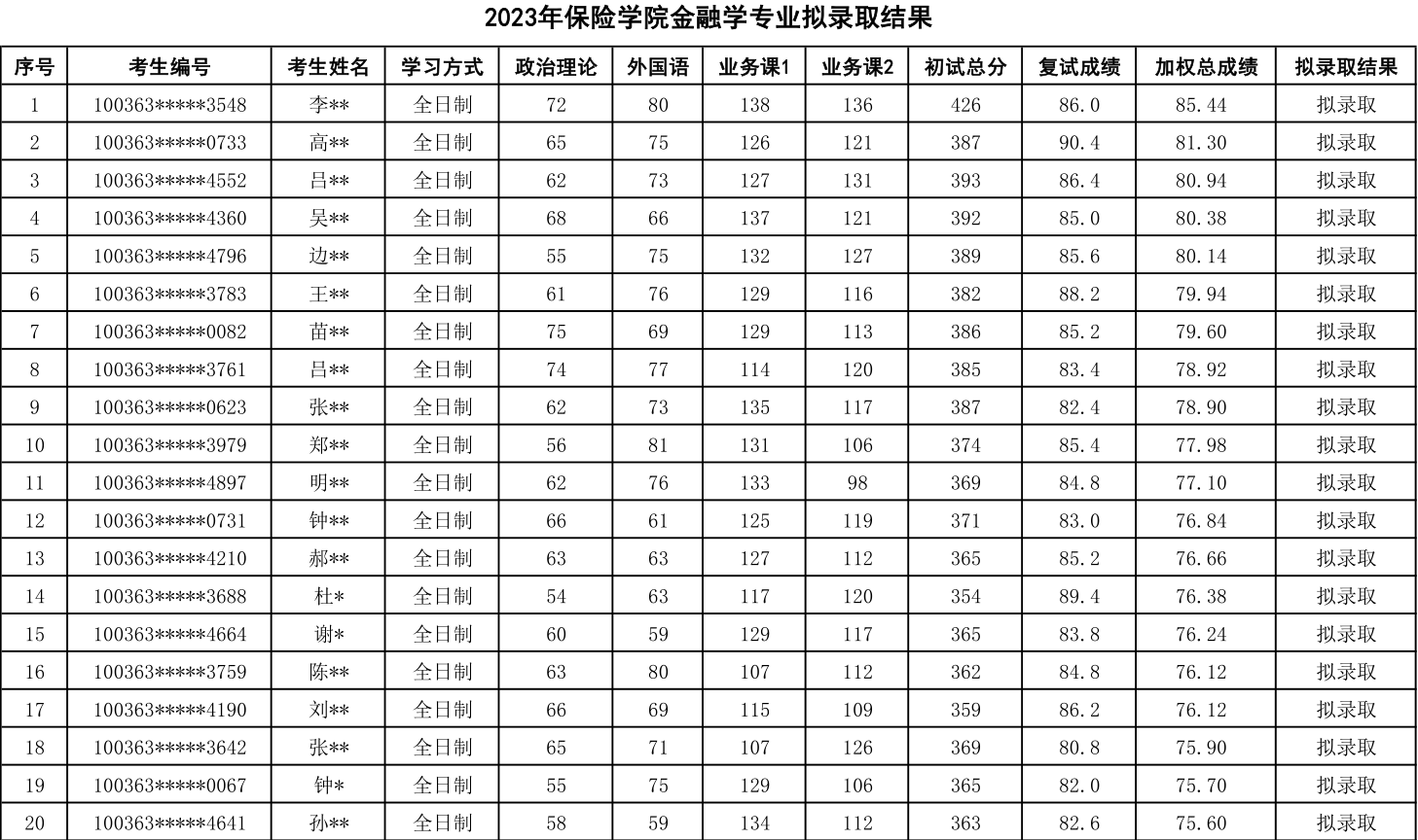 七、金融学(含:保险学)专业2023年考研拟录取结果