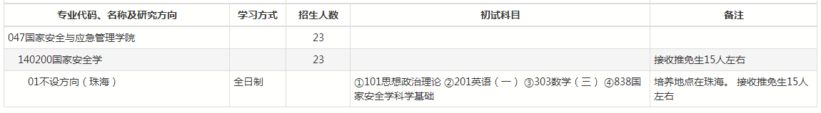 在研究生招生专业方面,学院建设国家安全学硕士、博士专业(首批国家安全学一级学科博士学位授权点),面向国家安全治理战略人才需求,旨在培养面向社会、资源、生态等非传统安全领域、具有大视野、全局性、战略性思维的高层次智库人才学术人才和行业领军人才。在培养上,以国家安全技术、国家安全治理、国家安全战略为扩展,侧重战略性,形成了适应时代需求的“本硕-博”综合型人才培养模式。