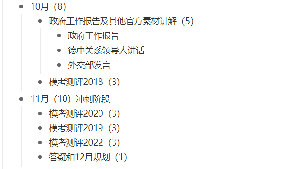 因为没学过相关课程,6-9三个月时间我都在学经济德语和跨文化那本书,也看一些公众号上的中德文新闻,没把精读和翻译放在心上,这是我备考期间犯的巨大错误。我后来认识到,经济德语解释了基础概念,但仅用这些应付考试是远远不够的。转机出现在我到10月份终于联系上了一位学姐。按照学姐给我的规划,我及时转变了学习思路,补完了高德2,整理好了重点词汇,开始狠抓翻译和阅读学姐给我找的材料,整理了很多针对性很高的表达,也提高了阅读和翻译能力(非常有用)。十一月,我开始做真题,越做越心惊,因为我发现真题其实跟给的参考书目的直接联系并不大,我前期的复习重点一直有点偏,我的整体语言能力被我看的参考书目给束缚住了。