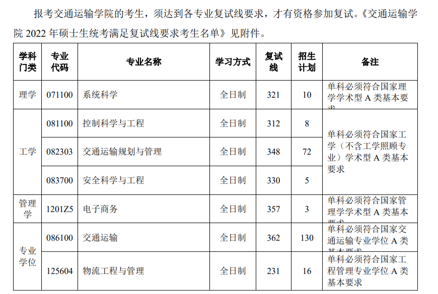2022年北京交通大学交通运输专业进入复试分为362,报考的学生大多数来自于几大铁路院校(兰州交大、华东交大、石家庄铁道学院)以及长安大学等,竞争还是比较激烈。一般初试分数线要超过分数线15分才比较稳妥,复试满分为220,总分=初始*60%+复试*40%,所以总体而言北交更看重初试成绩。报录比没有官方明确数据,但是根据历届考生及老师得知消息北交的报录比是1:1.5。下图是2022年进入复试的分数线。