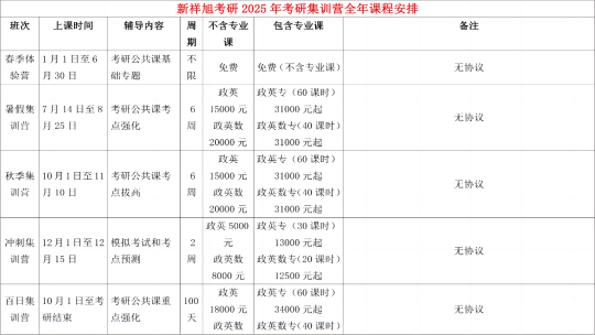 (四)集训营提供的其它服务:提供的服务内容包含:1)报考院校专业的考研情况介绍;2)根据学员基础情况,制定专属授课方案和授课计划;3)初试科目的参考书目知识点系统讲解;4)初试科目重点、难点、高频点的精讲;5)提供本专业考研真题笔记等考研资料;6)历年真题模拟练习及讲解,答题技巧指导;7)从报名到考研结束,全程课下答疑及跟踪服务。下附新祥旭考研集训营课表以及集训基地环境照片: