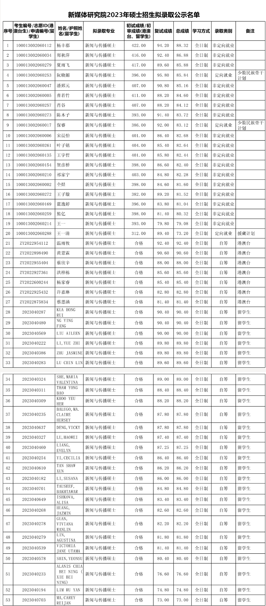 进复试:新媒体18人,其中少民2人援藏1人(最高分422,最低分393);国际新闻传播6人(411、401、398、393、385、382)