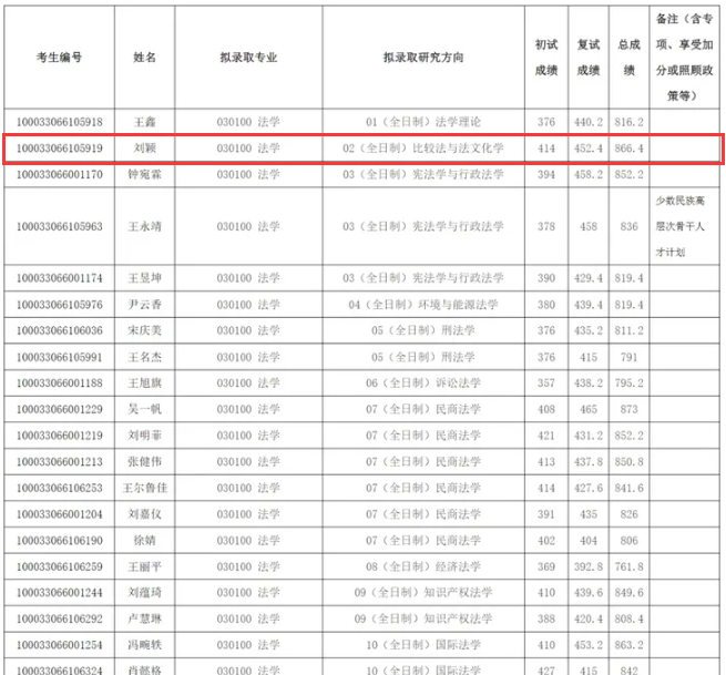 法学硕士分研究方向,按总成绩由高到低排序(总成绩并列,初试成绩排名在前的优先),其中专项计划单独排序,择优录取。