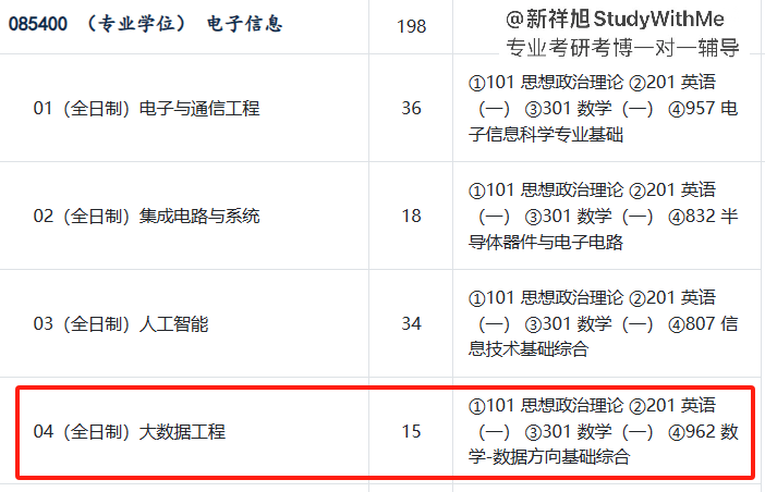 ①101 思想政治理论 ②201 英语(一) ③301 数学(一) ④962 数学-数据方向基础综合