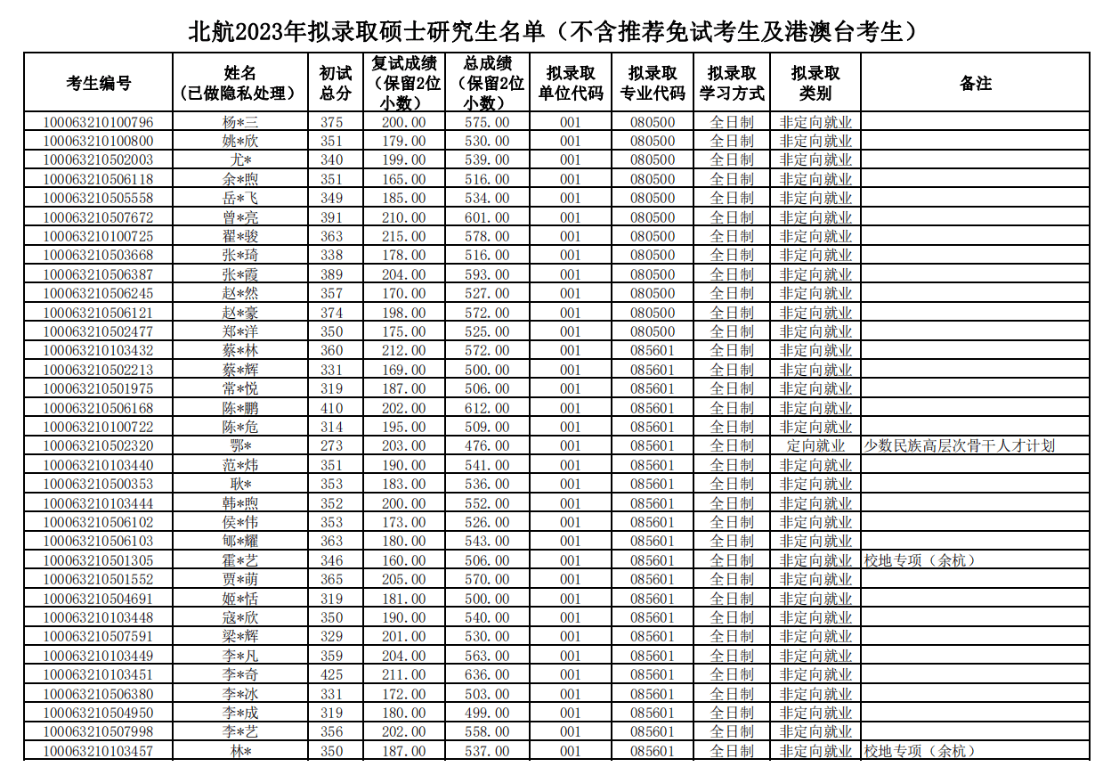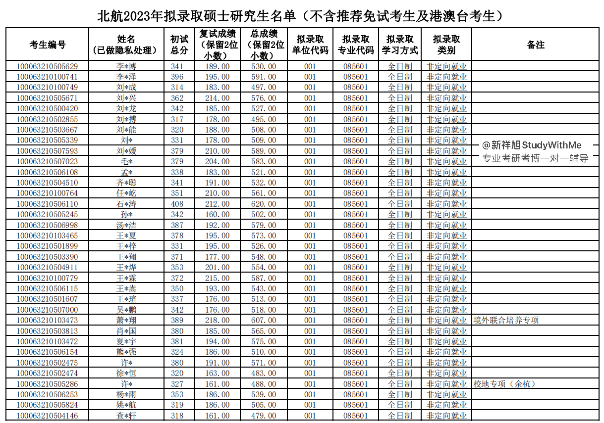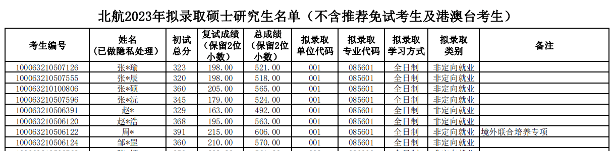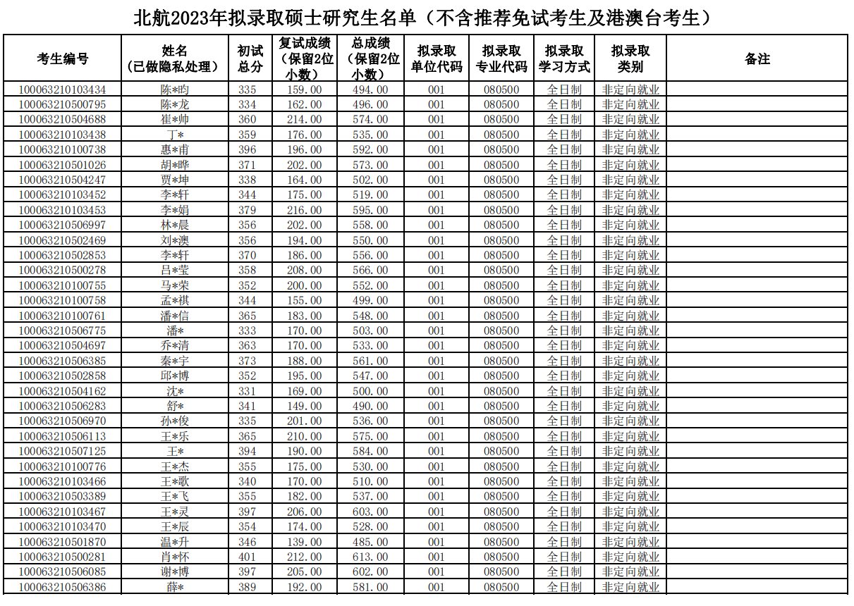 三、北京航空航天大学材料科学与工程学院考研录取名单、录取人数、录取分数区间
