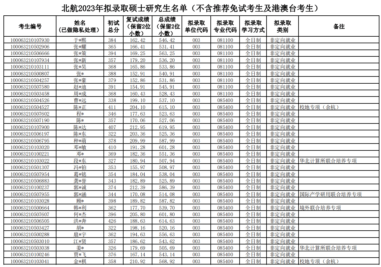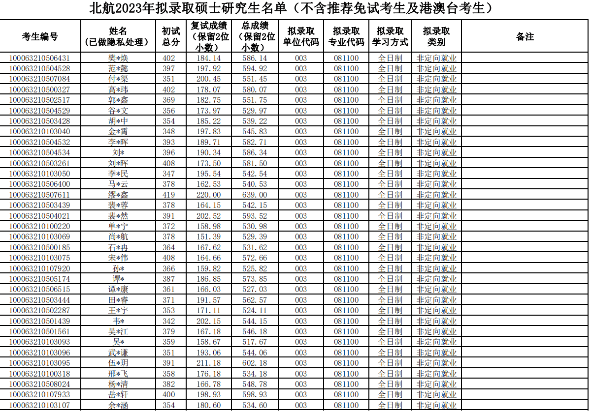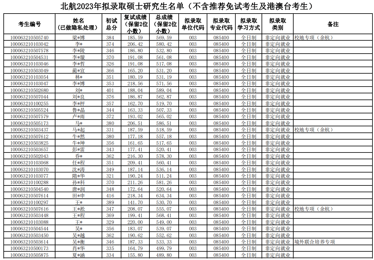 三、北京航空航天大学自动化科学与电气工程学院考研录取名单、录取人数、录取分数区间