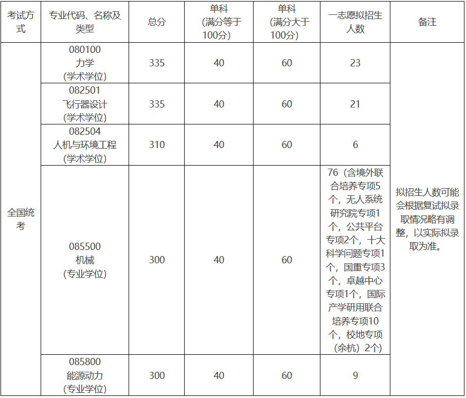 - 专业备注:学制3年,全日制学习方式。含境外联合培养专项10个,无人系统研究院专项15个,大飞机班专项20个。