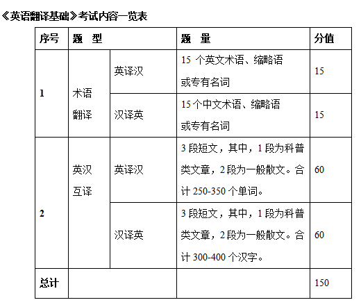 本科目的考试内容涵盖词语翻译和英汉互译两个部分。满分150分。