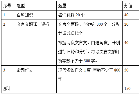 本科目考试内容涵盖百科知识、文言文理解与翻译及命题作文三个部分。满分为150分。