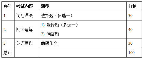 本科目考试内容涵盖词汇语法、阅读理解和英语写作三个部分。满分为100分。