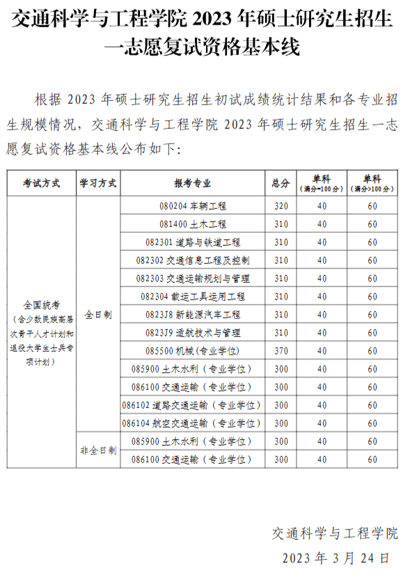 四、北京航空航天大学交通科学与工程学院2023年硕士研究生招生一志愿复试资格基本线