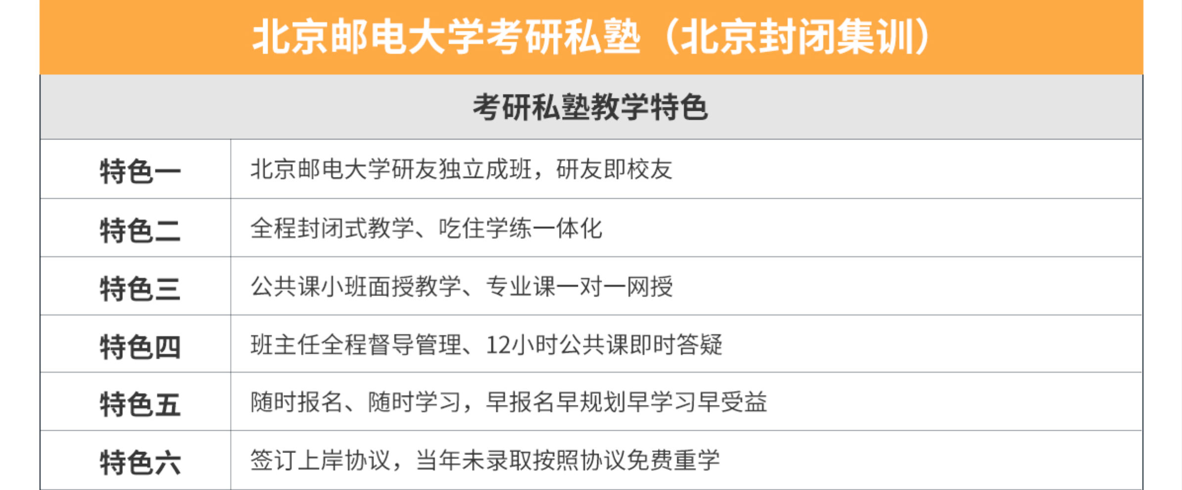 新祥旭考研机构开设有北京邮电大学考研私塾课程,北京邮电大学考研私塾为北邮考研学子提供专属的封闭式集训学习环境,考研私塾全程封闭式教学、吃住学练一体化;公共课小班面授教学(PS:若公共课某科特别弱亦可单独再另咨一对一针对性补习)、专业课一对一面授或网授;班主任全程督导管理、公共课专业课即时免费答疑。考研学员随报随学,专业务实,真诚周到,助力上岸!