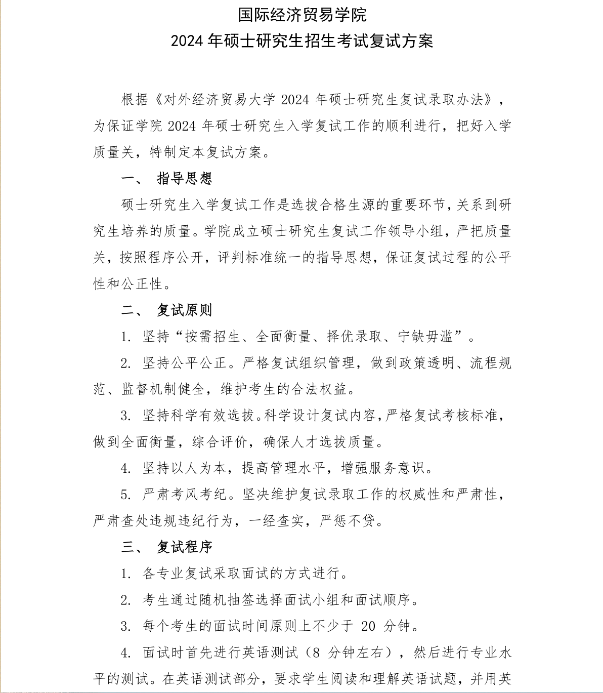 对外经济贸易大学国际经济贸易学院2024年硕士研究生招生考试复试方案