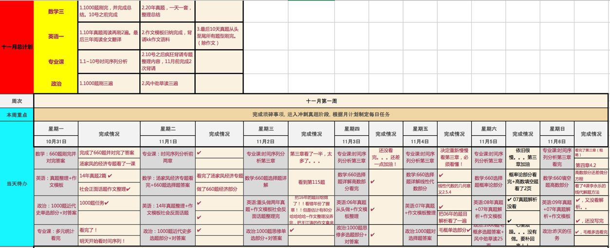 原因在于Excel非常灵活,自己想怎么安排就怎么安排。非常好用哟~利用Excel规划好自己每个月的计划,每个星期的计划以及每天的计划。一定一定要写下来,然后再定期回顾。因为我们是按照已经定好的目标分数奋斗的,所以详细的计划能够让我们看清楚自己所处的位置,更好的向前走,不至于歪了方向。可以参考我当初做的记录。