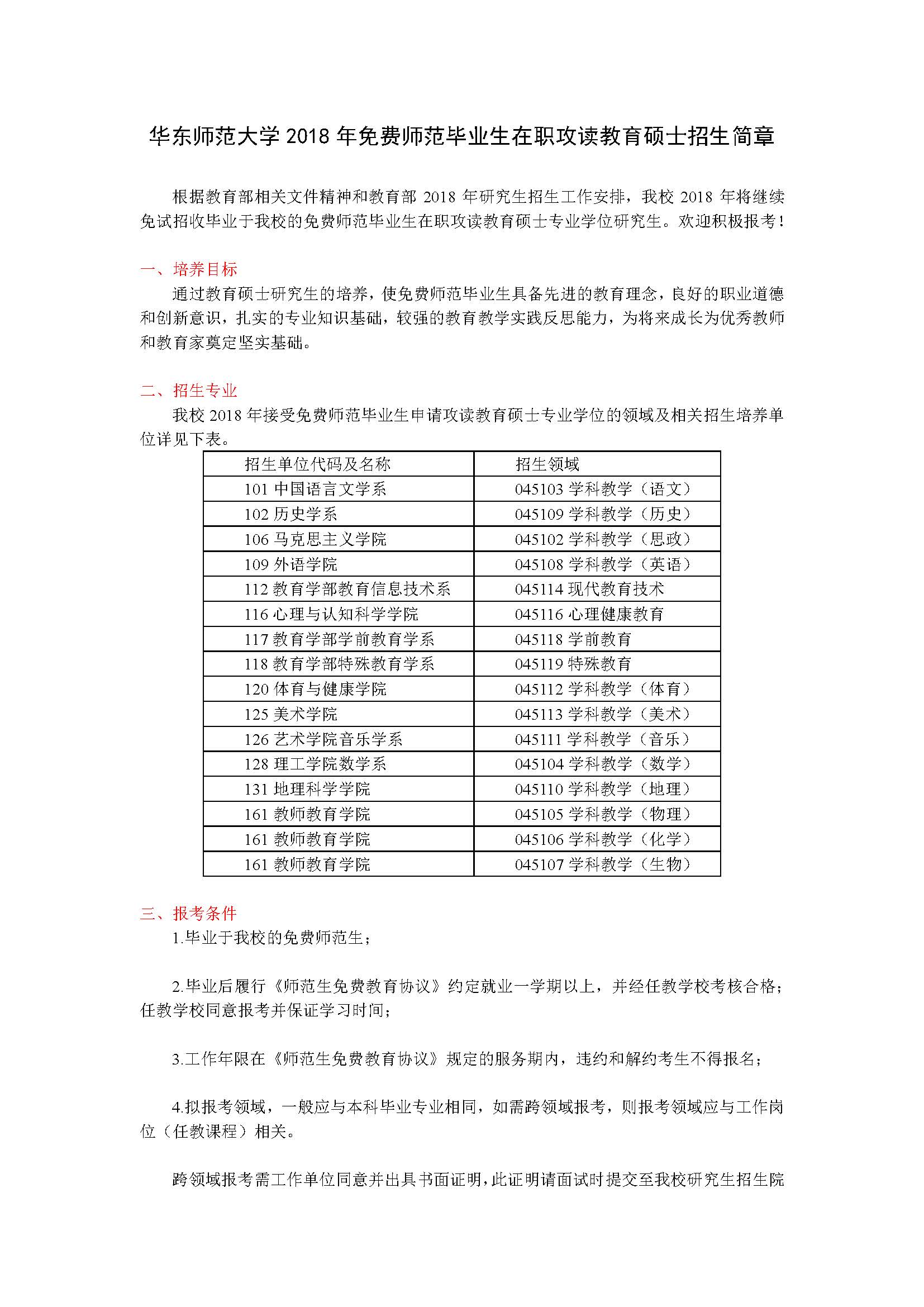 华东师范大学2018年免费师范毕业生在职攻读教育硕士招生简章
