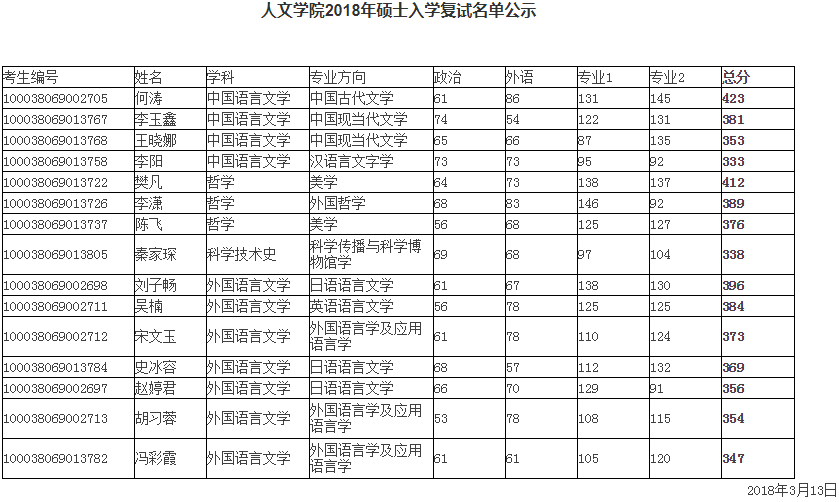 3月16日8:30-12:00到人文学院研究生办公室(新斋126)进行资格审查、确认复试信息等。入围复试的考生须携带本人以下材料到人文学院研究生办公室进行资格审查: