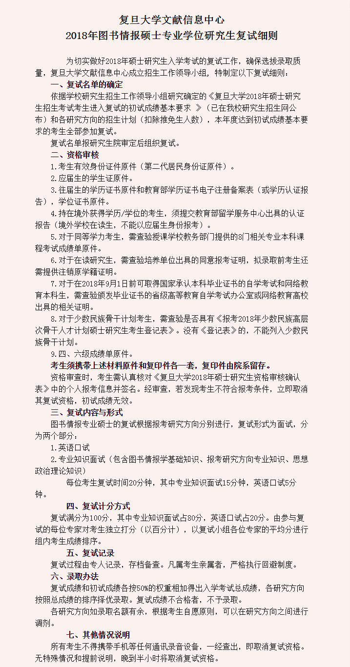 复旦大学文献信息中心2018年图书情报专业硕士复试名单