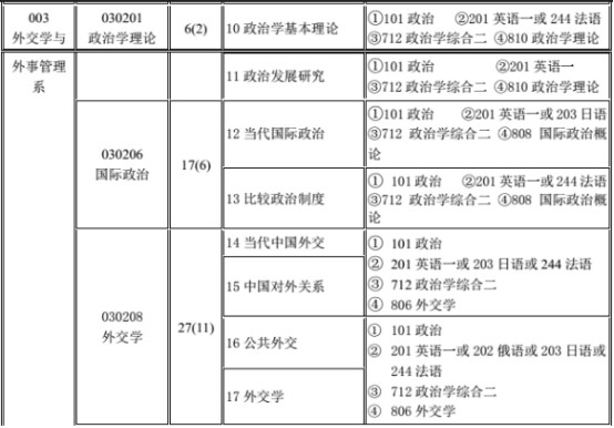 外交学专业旨在培养德、智、体全面发展,具有坚实的外语基础,掌握外交业务基本理论和技能的高素质、复合型外交外事人才。为此,系里开设了外交学概论、当代中国外交、当代国际政治、近现代中国外交史、战后国际关系史、国际关系理论、外交战略与安全、外交决策、外交政策分析、多边外交、中外政治制度、涉外礼仪、领事侨务知识和现代办公技能等课程,还开设了中美关系、战后中日关系等双边关系课程及欧盟研究、非洲政治与经济、英国政治与外交等地区和国别研究课程,部分课程采用双语或英语授课。此外学生还选修人文素质课程,并跨系选修国际法、国际经济方面的某些课程, 以提高文化素质,具备基本的涉外经济和法律知识。学业优良的本科生可以辅修英语、法学(国际法)专业、国际经济与贸易专业。系里重视外交外事专业教育的应用性,大力提倡和支持学生的实践活动。“模拟联合国”、“模拟外交谈判”、“外交外事礼仪大赛”等课外活动都取得了良好的效果。