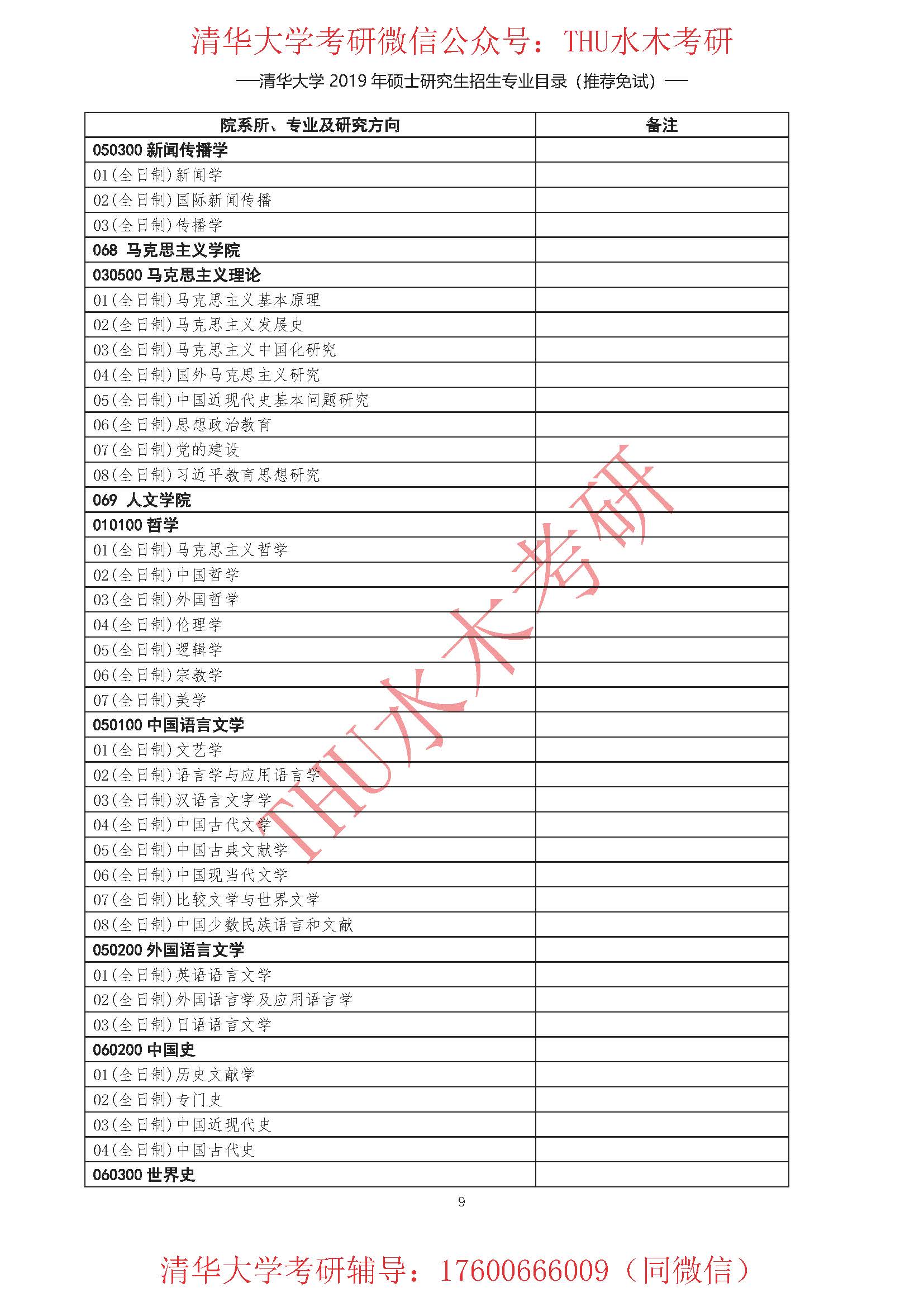 清华大学2019年硕士研究生推荐免试招生专业目录