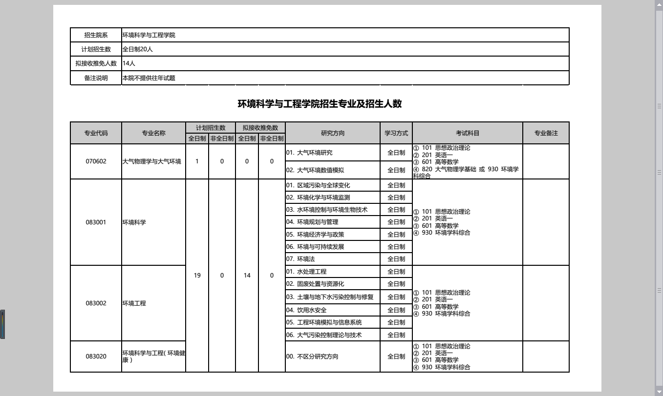 北京大学2019年环境科学与工程学院研究生考研专业目录